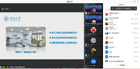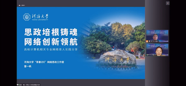 计信院本科生辅导员雷一帆以《思政培根铸魂,网络创新领航》为题,从把握思政工作主旨、搭建网络育人平台、创新思政教育实践三个方面,就学院“青春计E”网络思政工作室的建设与成效与参会人员进行了交流。江苏省计算机学会法人、计算机伦理与职业修养专委会主任、南京大学计算机学院党委书记武港山充分肯定了河海大学在网络育人方面的实践,尤其是“青春计E”网络思政工作室平台的建设,其做法对高校网络育人的实施有较强启发意义。