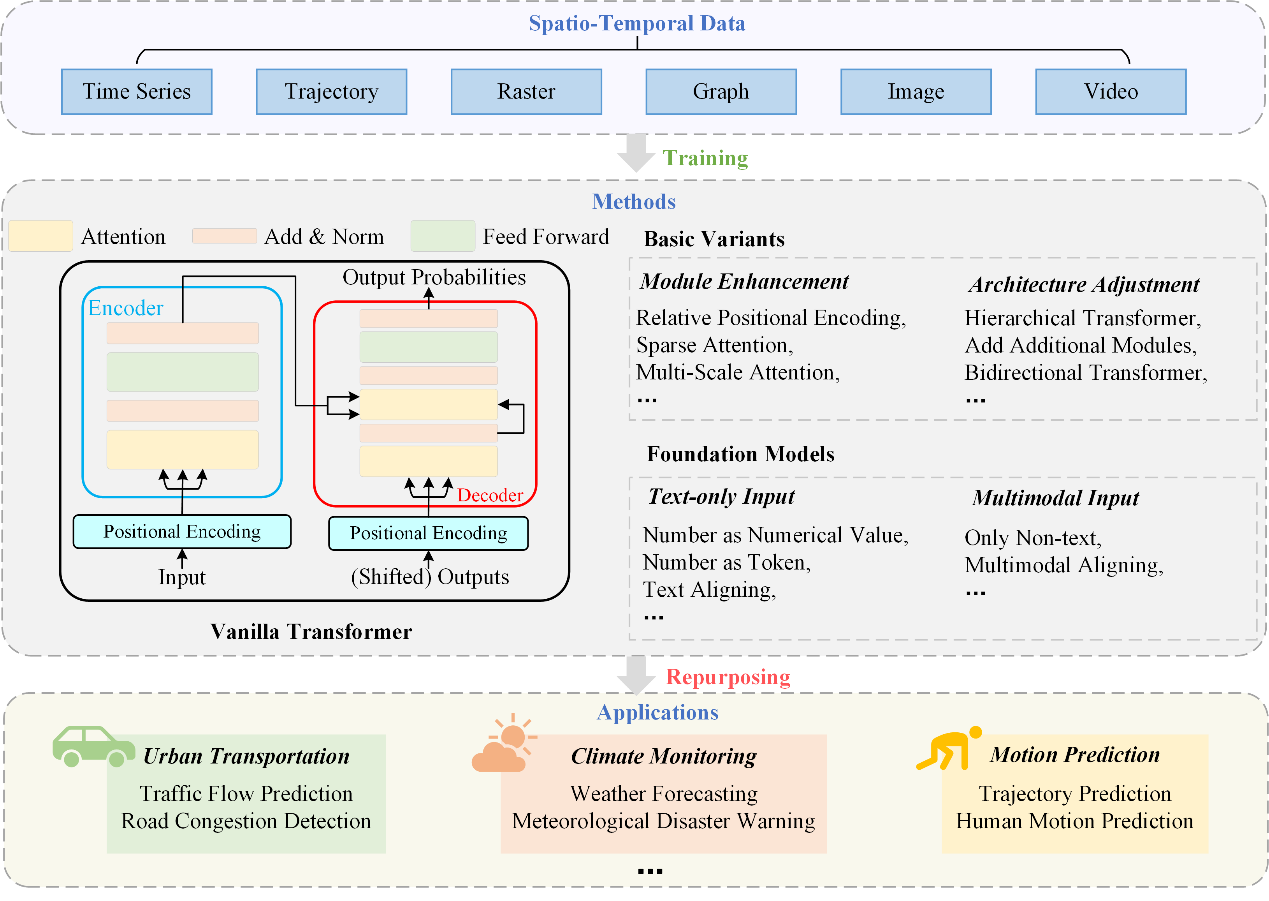时空预测广泛应用于智慧交通、气象预测和城市治理等场景。相较一般预测任务,时空数据同时具有时间演化、空间关联和复杂非线性关系,传统统计学习方法较难统一刻画多尺度、动态变化的依赖结构。近年来,Transformer及其衍生的大模型凭借卓越的长距离依赖捕获能力和泛化鲁棒性,为解决该问题提供了新思路。然而,现有综述多聚焦单一应用或多类模型,对“时空预测”任务下Transformer及衍生模型的系统性比较仍显不足。